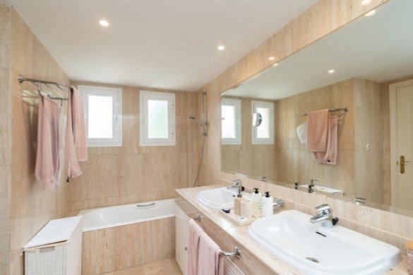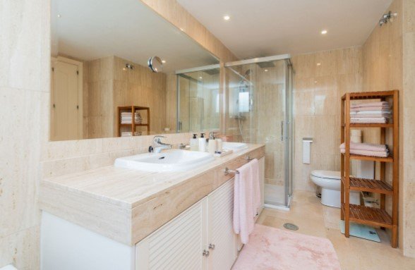 Cada uno de los 3 dormitorios cuenta con armarios empotrados y el confort de 3 baños, dos de ellos en suite. Los suelos de mármol y las persianas venecianas Luxaflex añaden un toque de elegancia a cada rincón. El aire acondicionado frío/calor garantiza un ambiente agradable en cualquier época del año.