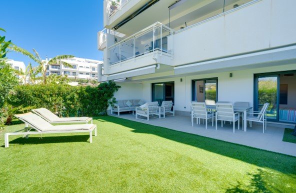 Descubre este luminoso y espacioso apartamento de dos dormitorios, idealmente ubicado en la planta baja de la exclusiva comunidad cerrada de El Lagar, en La Cala de Mijas.