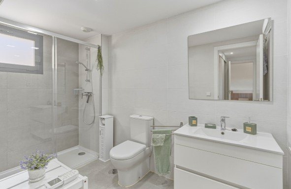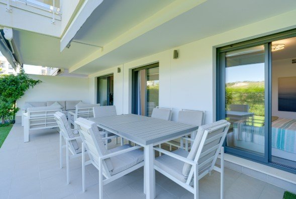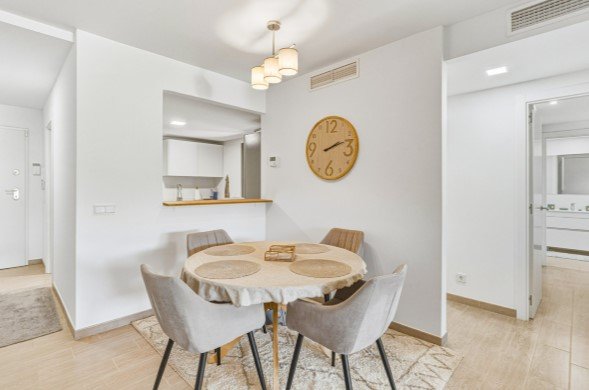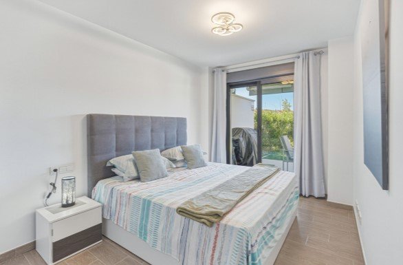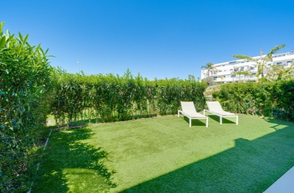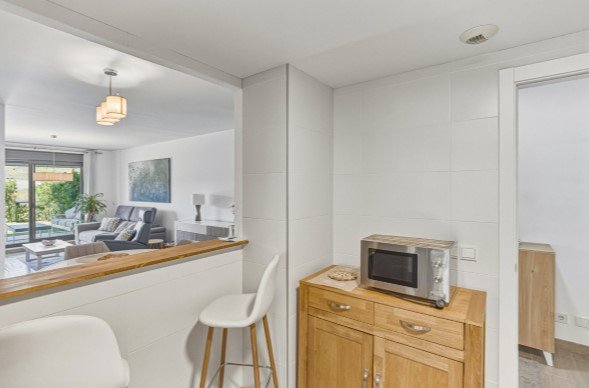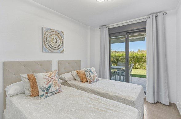 Con una superficie construida de 122 m² y un diseño que maximiza la luz natural, este hogar ofrece una sensación de amplitud que te encantará. Ambos dormitorios cuentan con acceso directo a una encantadora terraza y un jardín privado, perfectos para disfrutar del clima mediterráneo.El dormitorio principal incluye un baño privado, mientras que el segundo dormitorio tiene acceso a un baño familiar separado, ideal para huéspedes. La cocina, completamente equipada y con un práctico bar de desayunos, se integra perfectamente con el salón y comedor de planta abierta, creando un espacio ideal para compartir momentos inolvidables. Además, cuenta con un lavadero adyacente a la cocina para mayor comodidad.