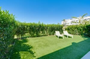 El jardín privado ofrece acceso directo a las zonas comunes, donde podrás disfrutar de una gran piscina y una zona de juegos infantil, perfectas para familias.