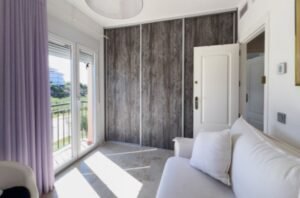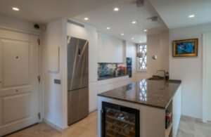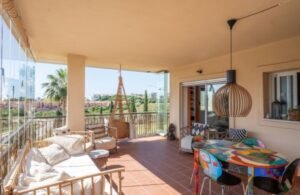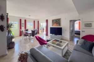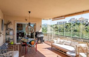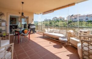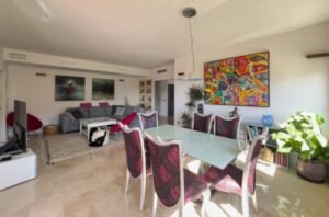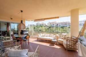 Impresionante apartamento que hace esquina de 3 dormitorios con vistas al mar y al jardín en El Chaparral. Este precioso apartamento de 3 dormitorios y 2 baños se encuentra en la codiciada zona de El Chaparral. Disfrute de vistas panorámicas a los jardines y al Mediterráneo desde su amplia terraza. Se encuentra en una urbanización cerrada, segura y bien cuidada, a solo 5 minutos a pie de la playa, tiendas y restaurantes, y a un corto trayecto en coche de La Cala de Mijas y Fuengirola. El complejo cuenta con una gran piscina comunitaria con socorrista y la propiedad incluye aparcamiento subterráneo y trastero. El apartamento ha sido recientemente renovado y cuenta con una moderna cocina de lujo con vinoteca. Hay un dormitorio principal con baño en suite y dos amplios dormitorios adicionales que comparten un baño.