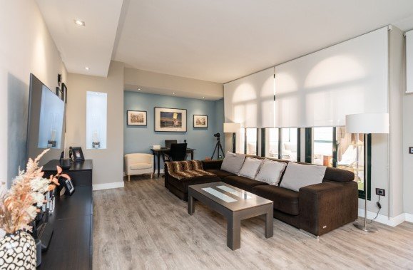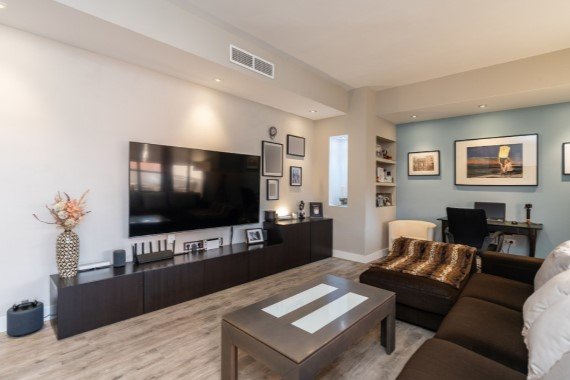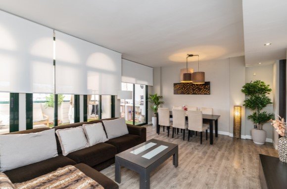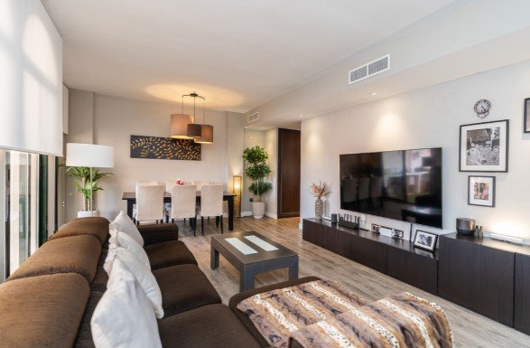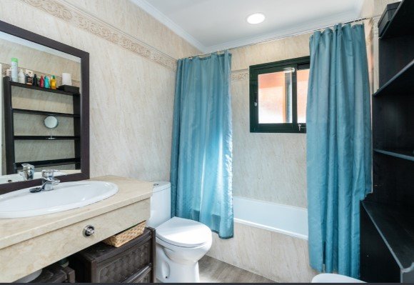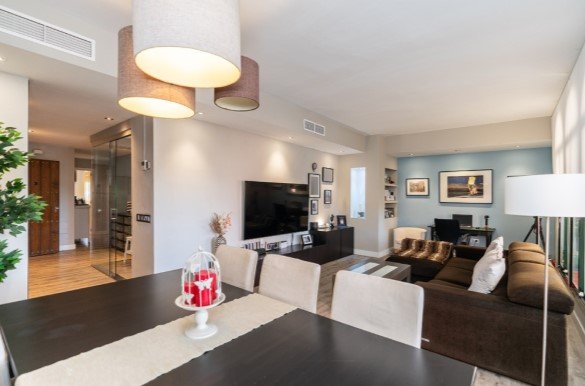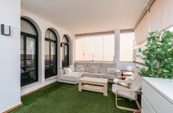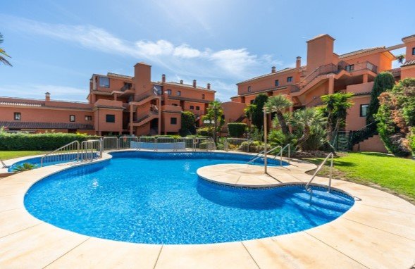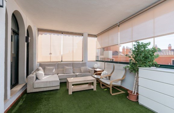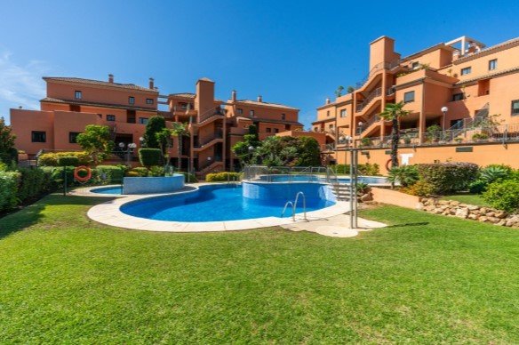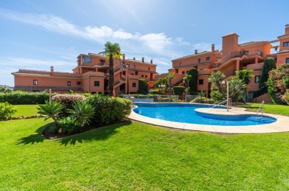 Apartamento de una sola planta en el complejo El Mirador de Santa María Golf en Elviria, Marbella Este. El apartamento ofrece tres dormitorios, dos baños, una cocina nueva y moderna totalmente equipada y un amplio y luminoso salón con acceso a la terraza cubierta y acristalada. Totalmente reformado, equipado con aire acondicionado frío-calor, suelos de madera y se vende amueblado. Tiene orientación sur. El precio incluye una plaza de aparcamiento subterráneo doble y un amplio trastero. Urbanización cerrada, muy tranquila y familiar con tres piscinas y jardines, junto al campo de golf de Santa María, a poca distancia en coche de todos los servicios y de la playa así como de los colegios Alemán y Ecos. El centro de Marbella y los centros comerciales están a 10 minutos en coche.